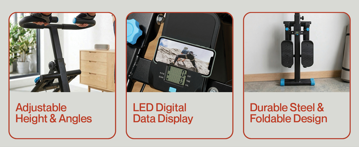 Customisable Ergonomic Comfort: Tailor the machine perfectly to your body and routine. With easily adjustable handlebar heights and customisable anti-slip pedal angles you can effortlessly switch up your workout while maintaining a safe ergonomic and highly effective posture.