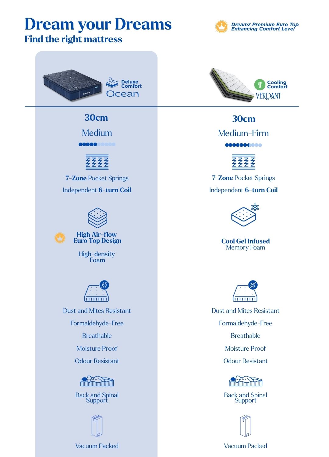 We understand that you may found confused or indecisive after browsing so many types of mattresses. Do not worry we get you! First we want to assure you choosing Dreamz will be the best decision you made this year. Second we have picked our top sellers loved by our customers to compare their key features just at the glance. So you can make an easier decision.