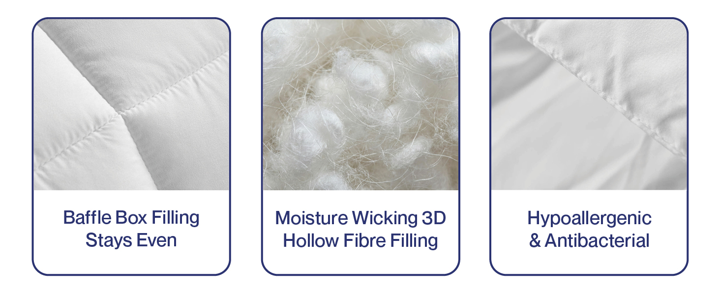 Advanced Hypoallergenic Protection: Sleep peacefully in a fresher space. The 3D hollow siliconised fibre filling is naturally hypoallergenic and anti-microbial actively minimising bacteria and dust accumulation making it the perfect choice for allergy sufferers.