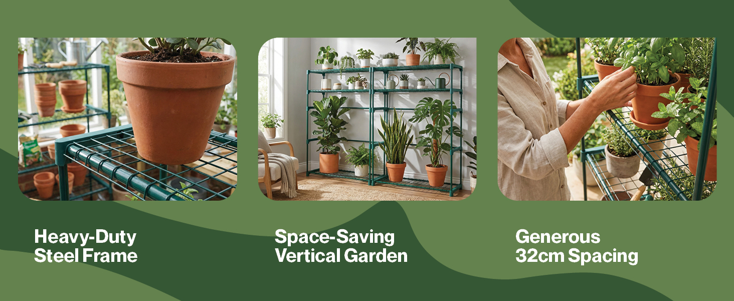 Heavy-Duty Steel Frame: Rely on outstanding durability. Built from high-quality steel this sturdy tiered stand comfortably holds up to 10kg per shelf and is highly resistant to rust and insect damage for years of dependable use.