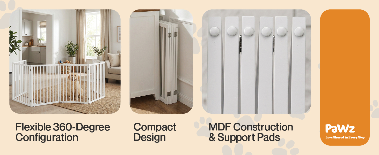 Flexible 360-Degree Hinges: Configure the gate to perfectly suit your specific space. The durable steel hinges swing a full 360 degrees allowing you to easily shape the six MDF panels around doorways hallways or open-plan living areas.
